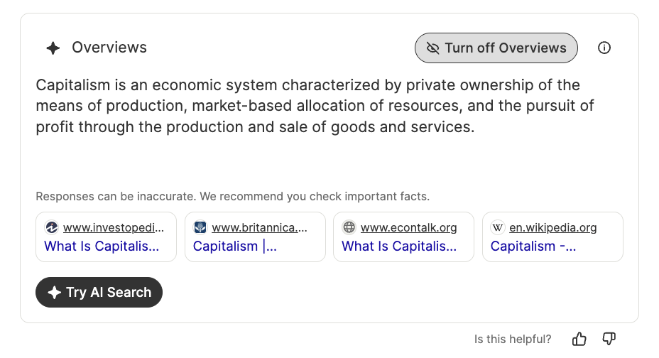 AI Overviews are not available to all users. The option will only appear in your settings if the feature is available to you. If you don’t have access yet, you may still see other non-AI features such as Instant Answers designed to enhance your search experience.