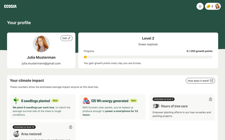 The new impact counter helps you visualize the climate impact you’re having with Ecosia. The more seeds you collect, the more of a difference you’re making with us! Collecting seeds allows you to level up. Your climate impact grows with each level.