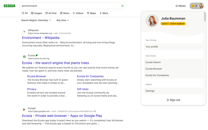 Collecting seeds allows you to level up. On your profile page, you can see the estimated real-world impact of your searches. These numbers are based on global averages for Ecosia users at your level and give you an idea of how your activity contributes to positive change.